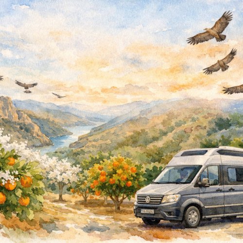 Frostiger Morgen, Serpentinen ins Jerte-Tal und weiße Kirschblüten soweit das Auge reicht. Dazu Gänsegeier über dem Tajo, grüne Weite in der Extremadura und stille Stellplätze fernab der Küste. Eine Reise durch ein überraschend vielfältiges Spanien – rau, ruhig und eindrucksvoll.