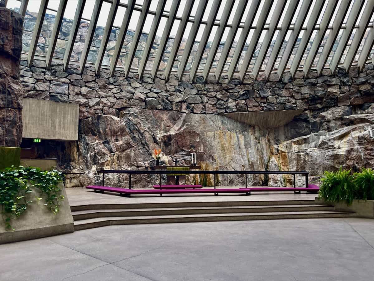Sie wurde Ende der 1960er-Jahre eröffnet und direkt in einen massiven Granitfelsen hineingebaut. Das Tageslicht fällt durch ein kreisrundes Oberlicht auf den rohen Fels und den schlichten Innenraum, wodurch eine besondere Mischung aus Monumentalität und Ruhe entsteht. Die Akustik soll außergewöhnlich sein, so dass die Kirche oft für Konzerte genutzt wird.