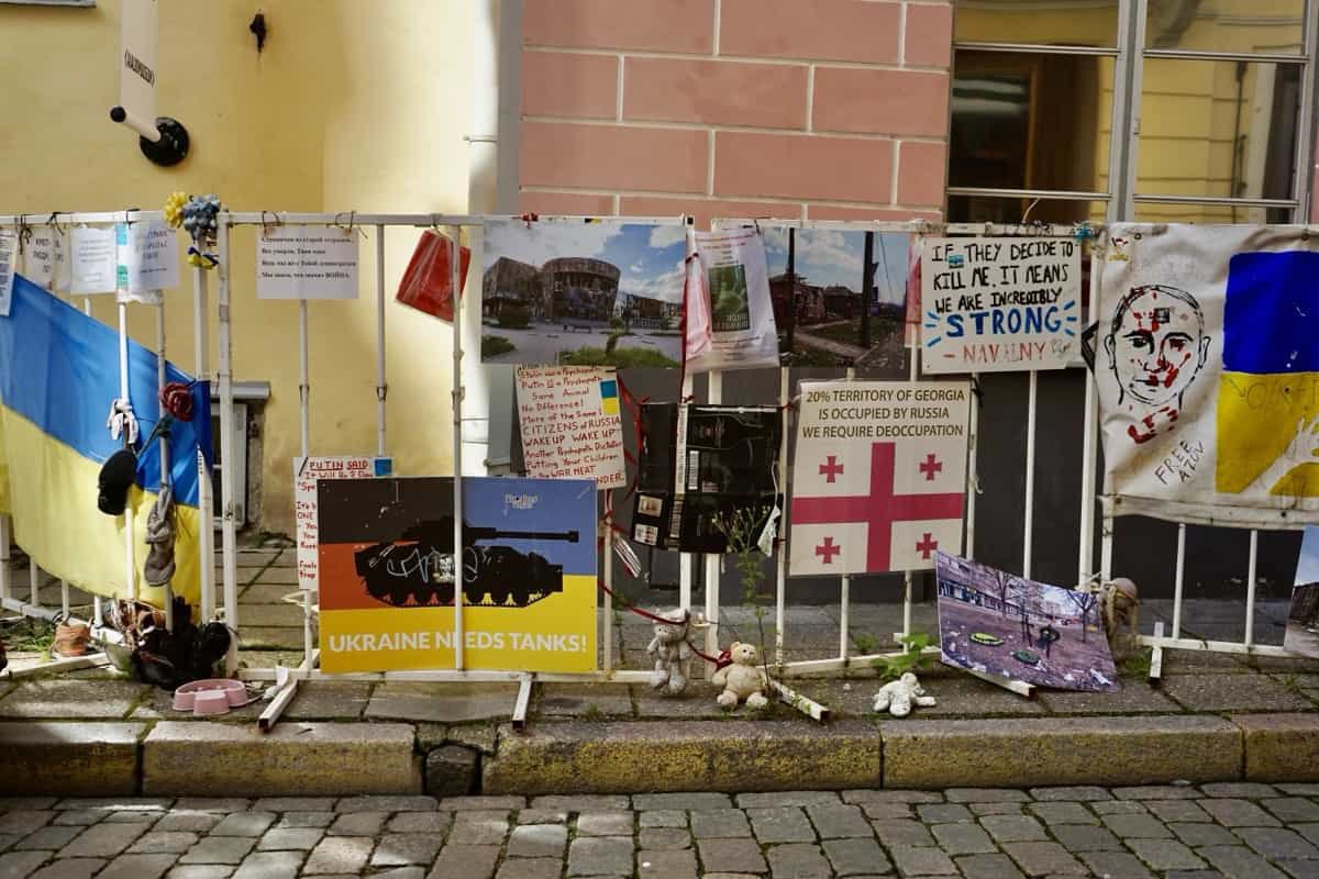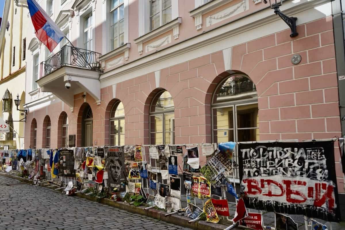 Ein paar Schritte weiter, vor der Russischen Botschaft, eine unübersehbare Plakatwand: Parolen, Fotos, Mahnungen. Deutlich, emotional, unversöhnlich. Die estnische Geschichte mit Russland ist keine ferne Episode, sondern eine offene Wunde. Und der Ukraine-Krieg hat vieles wieder aufgerissen, was eigentlich verheilt war.