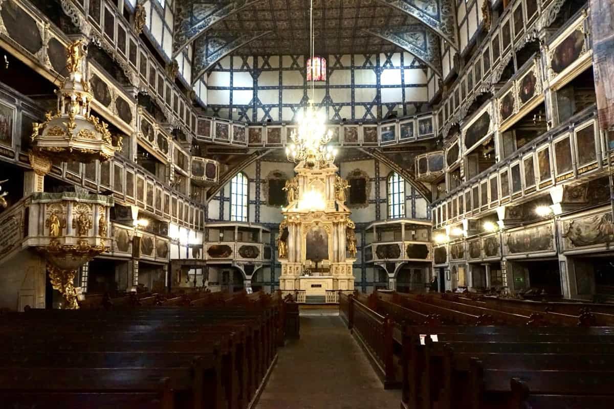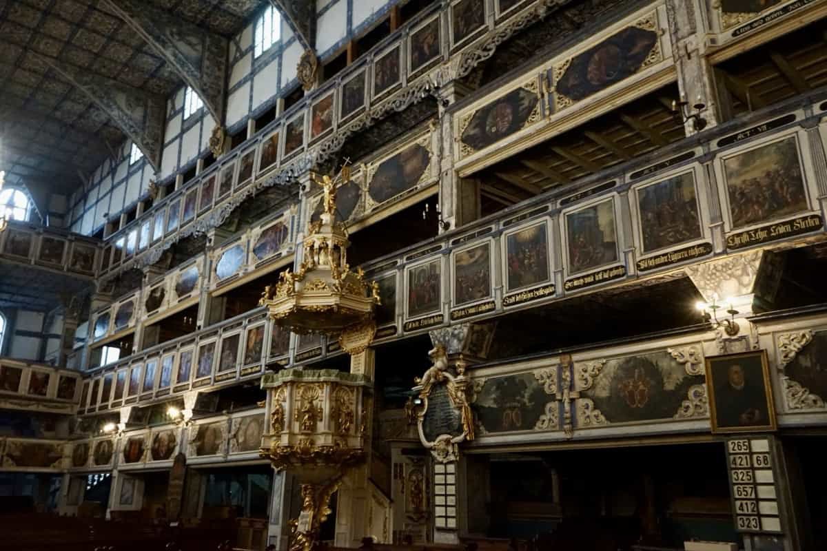 Jarów schließlich ist eine unscheinbare Kleinstadt – doch mitten darin steht eine Fachwerkkirche, die mich schlichtweg umgehauen hat. Außen eher schlicht, offenbart sie im Inneren eine Fülle von Malereien und Holzschnitzereien, die man in einem so kleinen Ort kaum erwarten würde. Es ist einer dieser Orte, die man zufällig entdeckt und die sich tief einprägen – ein stilles Kleinod mit beinahe magischer Wirkung.