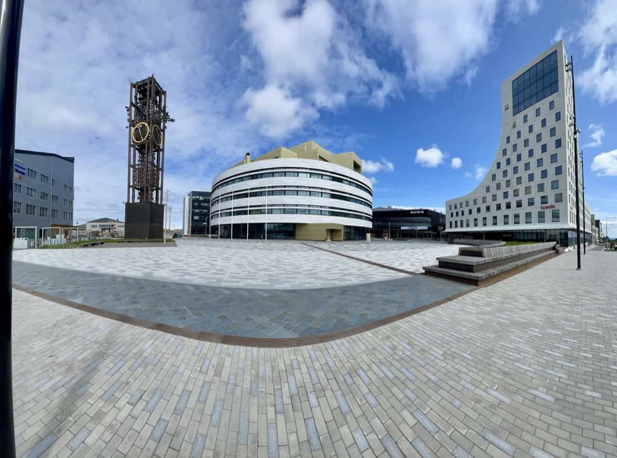 Im alten Teil der Stadt steht noch die berühmte Holzkirche, errichtet im Stil einer samischen Kote. Sie ist ein architektonisches Kleinod – doch wir stehen vor einem Bauzaun. Die Kirche wird aktuell transportfähig gemacht. Der Plan: Sie wird im August als Ganzes um drei Kilometer versetzt, ein außergewöhnliches Unterfangen. Wer sich dafür interessiert, findet hier beeindruckende Einblicke in das Projekt: Kiruna – eine ganze Stadt zieht um.