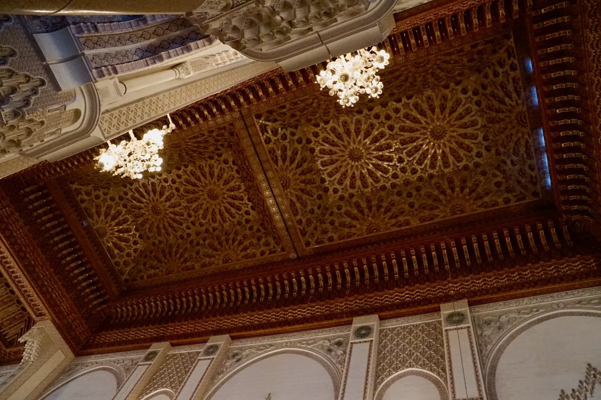 Im Inneren zeigt sich der hohe Aufwand, der in den Bau gesteckt wurde. Zedernholzdecken, kunstvoll geschnitzte Ornamente, Mosaike und Marmorböden – vieles davon in traditioneller Handarbeit gefertigt. Trotz der opulenten Gestaltung wirkt der Raum nicht überladen, sondern klar strukturiert und von einer fast ruhigen Würde geprägt.